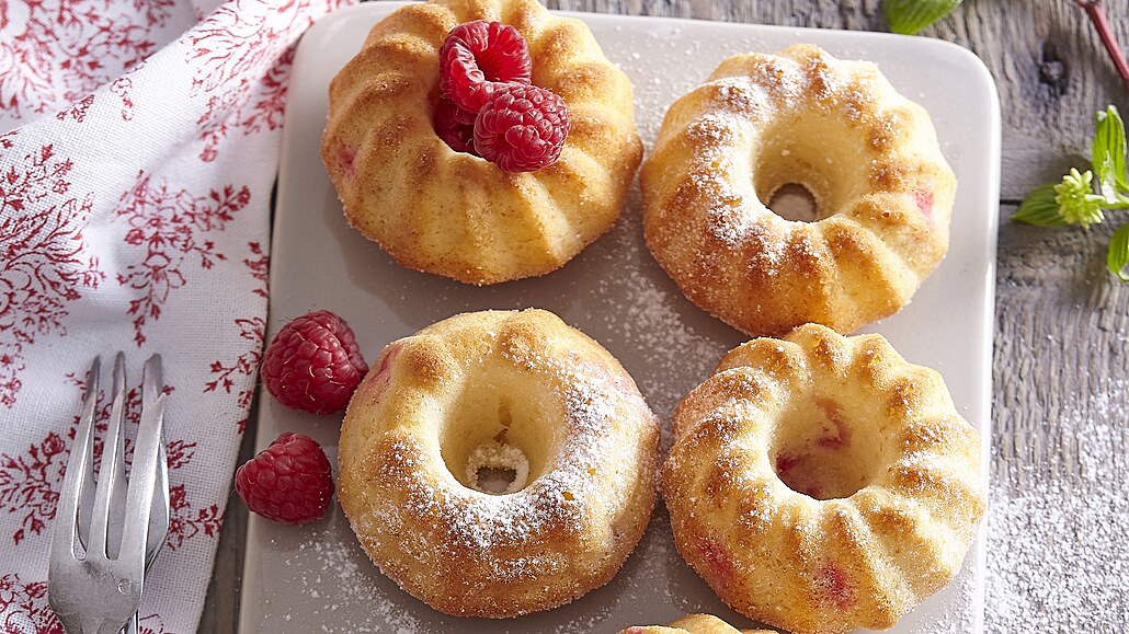 - Upečené bábovičky vyklopíme a necháme je vychladnout na mřížce. Podáváme s čerstvými malinami a jemně posypané moučkovým cukrem.