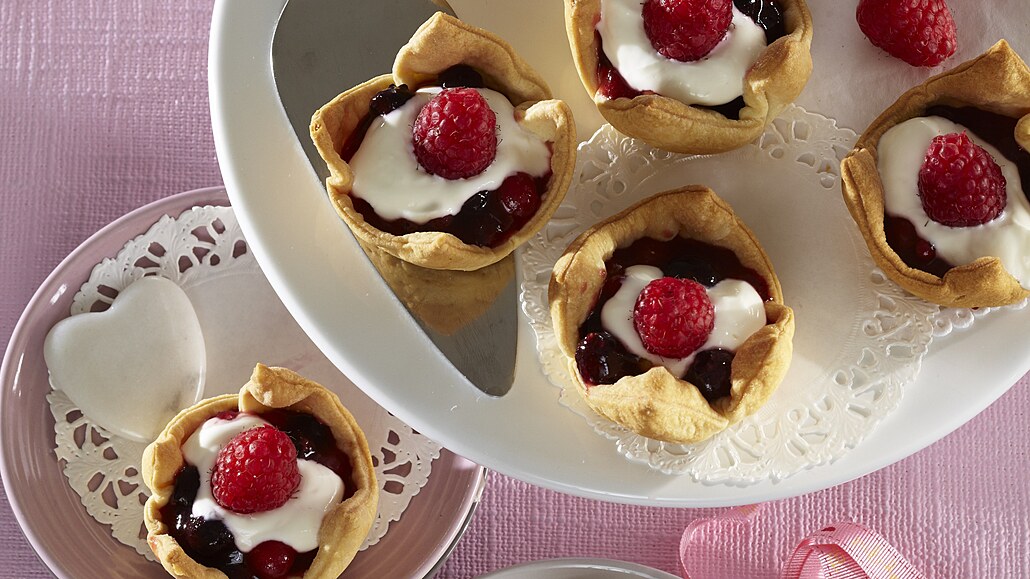 - Zakysanou smetanu rozmícháme a lžící dáme vždy trochu smetany do každého košíčku. Každý košíček ozdobíme čerstvou malinou a posypeme zlehka moučkovým cukrem.