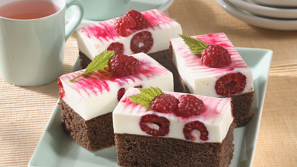 - Ze smetany ke šlehání připravíme šlehačku a vmícháme ji do náplně. Polovinu jí rozetřeme na vychladlý korpus. Poklademe ji 2/3 očištěných malin, které pak zakryjeme zbylým krémem. Moučník necháme v chladničce ztuhnout. Pak jej nakrájíme, ozdobíme zbylými malinami a lístky bylinek.