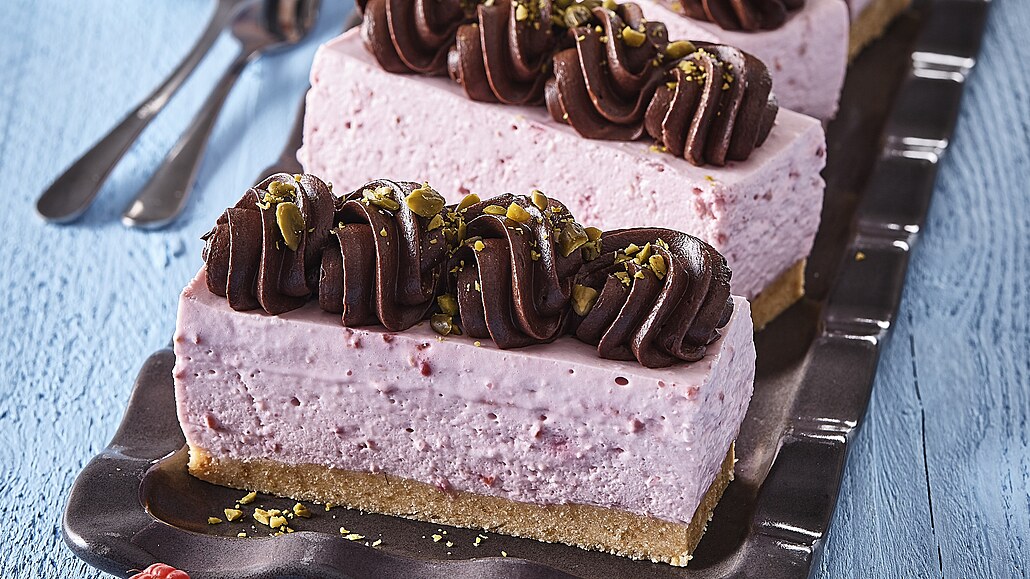 - Čokoládu rozpustíme na horké vodní lázni společně s máslem. Odstavíme a necháme zchladnout na 30 °C. Pak do ní vmícháme mascarpone a krátce prošleháme. Řez nakrájíme na porce a na povrch nastříkáme pomocí cukrářského sáčku s řezanou trubičkou připravený čokoládový krém. Řezy nakonec posypeme nasekanými pistáciemi a podáváme.