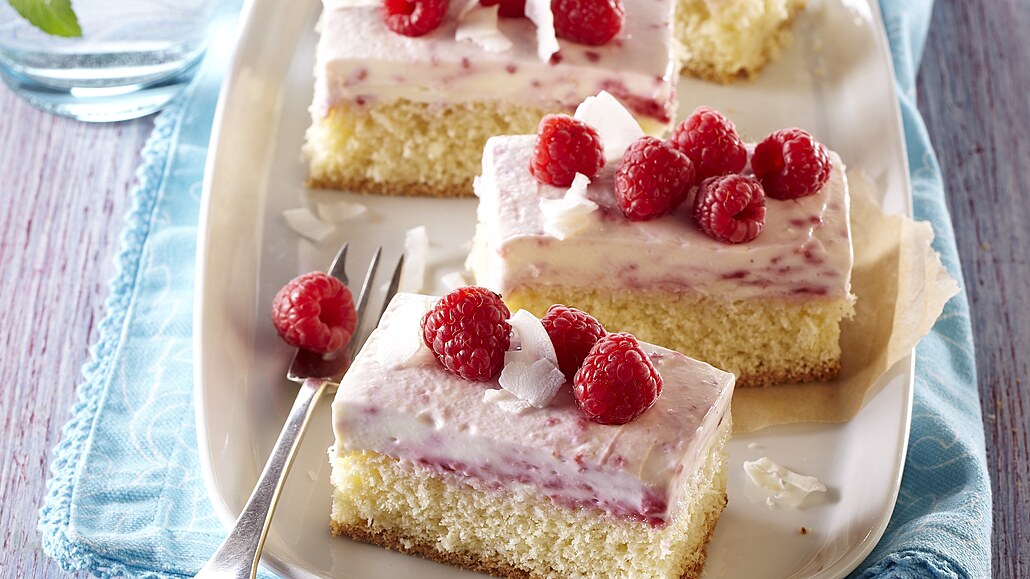 Svěží tvarohový krém s citronovou kůrou a malinami dělá z těchto řezů přepychově osvěžující dezert. Kokosové lupínky na povrchu dodávají moučníku nádhernou texturu a jemnou vůni.