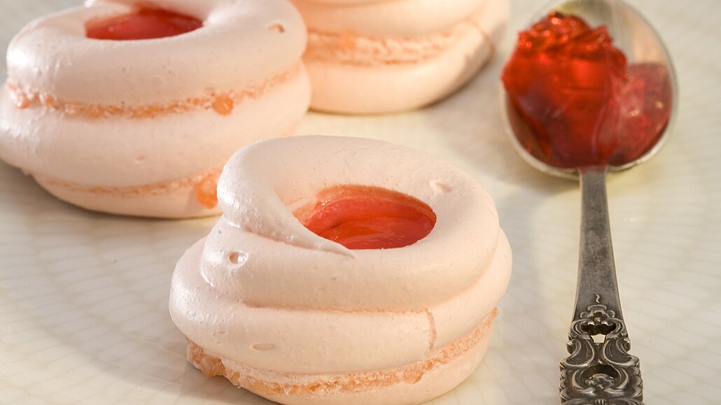 - Bílky šleháme nejdříve v horké vodní lázni s polovinou cukru tak dlouho, až se cukr rozpustí. Pak nádobu sundáme z vodní lázně a šleháme robotem na nejvyšší rychlost. Postupně přidáváme po lžících zbylý cukr. Vyšleháme na pevný sníh. Nakonec lehce vmícháme malinový sirup a prosátý moučkový cukr.