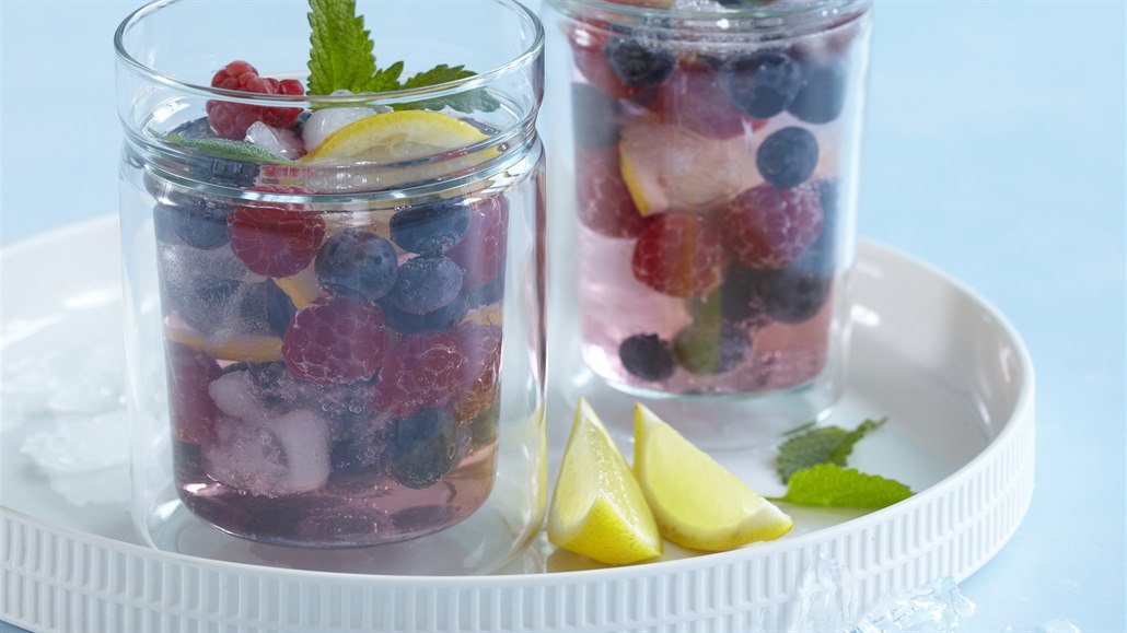 - Do sklenic rozdělíme kousky citronu, pár kostek ledu, borůvky, zbylé maliny a lístky meduňky. Zalijeme trochou malinového sirupu a likéru. Nakonec sklenice doplníme šumivým vínem. Podáváme dozdobené čerstvou meduňkou.