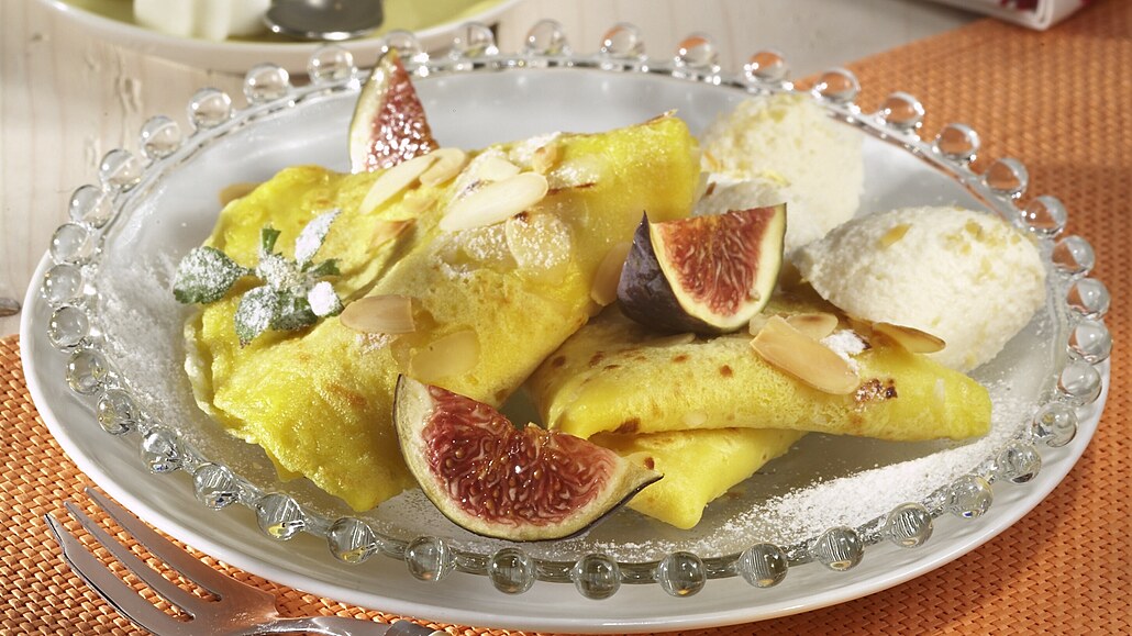 - Žloutky oddělíme od bílků. Víno promícháme s vodou, žloutky, cukrem a zahřejeme na 60 °C . Přidáme škrobovou moučku rozmíchanou v troše vody a krátce prohřejeme při 70 °C. Necháme vychladnout a lehce vmícháme tuhý sníh z bílků. Pěnu necháme v chladničce zatuhnout asi 30 minut. Pak pomocí lžiček vykrajujeme nočky. Pokládáme je na palačinky složené do šátečku. Posypeme moučkovým cukrem a ozdobíme čerstvým ovocem např. fíky.