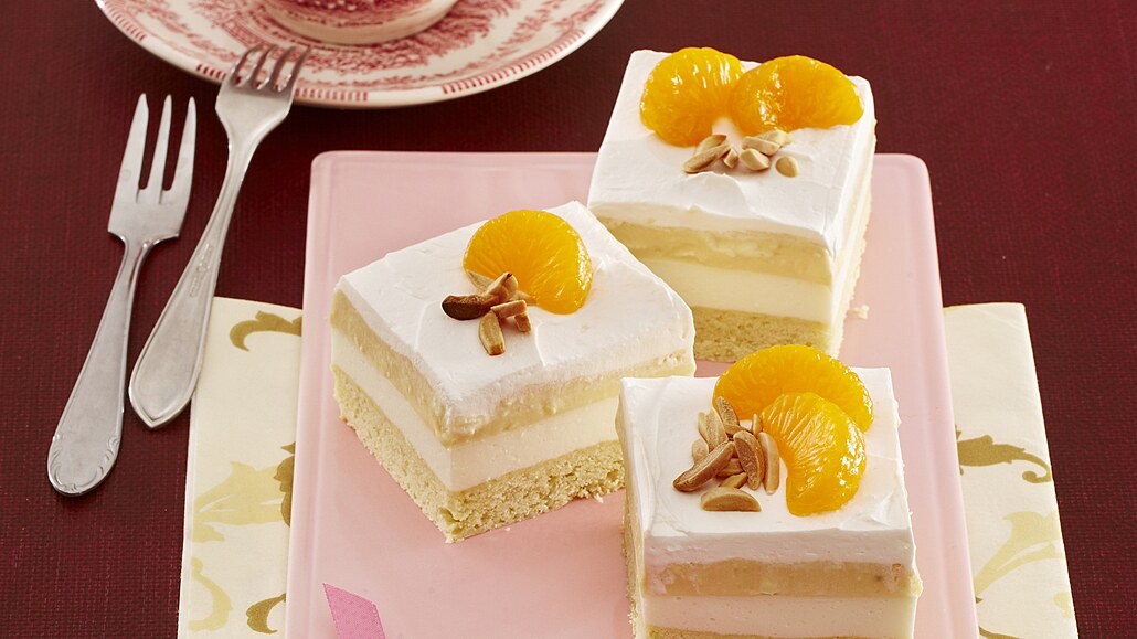- Smetanu vyšleháme s vanilkovým cukrem v pevnou šlehačku. Rozetřeme ji na povrch moučníku, nakrájíme ho na porce a ozdobíme mandlemi a mandarinkami.