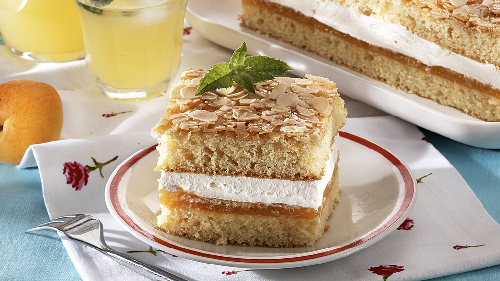 - Ušleháme smetanu s vanilkovým cukrem dotuha a rozetřeme na ztuhlou meruňkovou náplň. Přikryjeme dílem korpusu s mandlovou krustou a rozkrájíme.