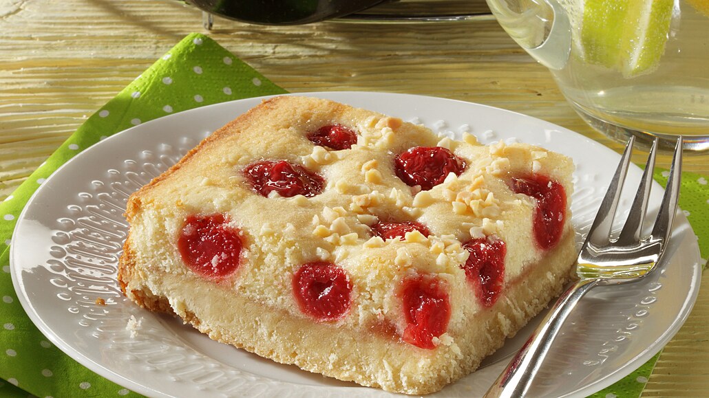 - Třešně opláchneme a necháme okapat. Poté je odstopkujeme. Předpečené těsto vyjmeme z trouby a potřeme džemem a třetinou šlehaného těsta. Navrch rozložíme třešně a zakryjeme zbylým těstem. Koláč posypeme sekanými mandlemi a vrátíme do trouby na 30 minut dopéct.
