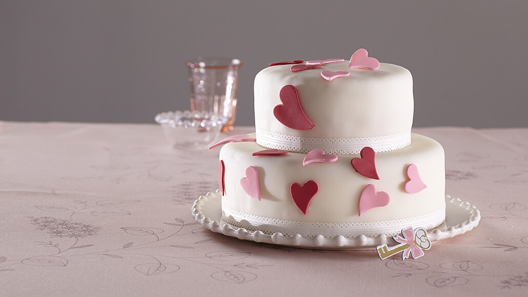 - Zbylou hmotu obarvíme na růžovou barvu. Rozválíme a vykrájíme srdíčka. Pak hmotu obarvíme na červenou barvu, rozválíme a vykrájíme srdíčka. Srdíčky ozdobíme povrch dortu.