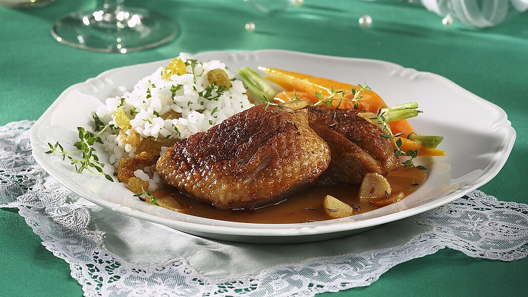 - Do výpeku vmícháme mouku a rajský protlak, vše orestujeme, pak zalijeme vývarem a necháme asi 15 minut provařit. Husí prsa se šťávou rozdělíme na talíře a ozdobíme tymiánem. Jako příloha je vhodná rozinková rýže a podušená mladá karotka.