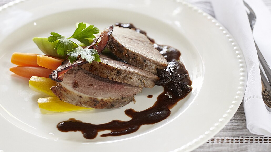- Maso očistíme, odkrojíme blány a šlachy a uschováme je. Čisté maso svážeme provázkem do úhledného válečku a položíme na potravinářskou fólii. Obložíme ho rozebranou cibulí a plátky česneku, posypeme tymiánem, rozmarýnem a roztlučeným jalovcem, pokapeme červeným vínem. Zabalíme ho do fólie a necháme v chladu marinovat do druhého dne.