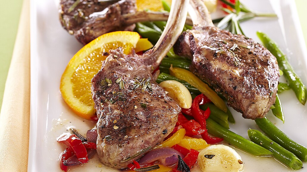 - Kotletky vyjmeme z marinády a pozvolna je opečeme v pánvi na zbylém rozehřátém oleji z obou stran. Přisypeme připravenou zeleninu a vše ještě asi 10 minut opékáme. Nakonec přidáme zbylou snítku rozmarýnu, přilijeme vymačkanou šťávu z druhého pomeranče, dochutíme solí a pepřem. Jehněčí kotletky podáváme s restovanou zeleninou, ozdobené plátky pomeranče.