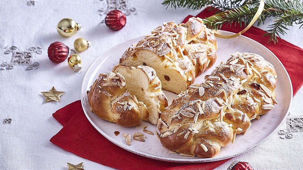 - Na pomoučněném vále rozdělíme vykynulé těsto na 6 dílů a každý kus dále na 5 částí. Vyválíme z nich prameny dlouhé asi 25 cm. Nejdříve spleteme cop ze 3 pramenů. Konce těsta k sobě dobře přitiskneme a střed potřeme rozšlehaným vejcem. Pak stočíme 2 prameny a položíme na pomašlovaný povrch. Konce zahneme pod vánočku. Stejným způsobem připravíme i zbylé pečivo.