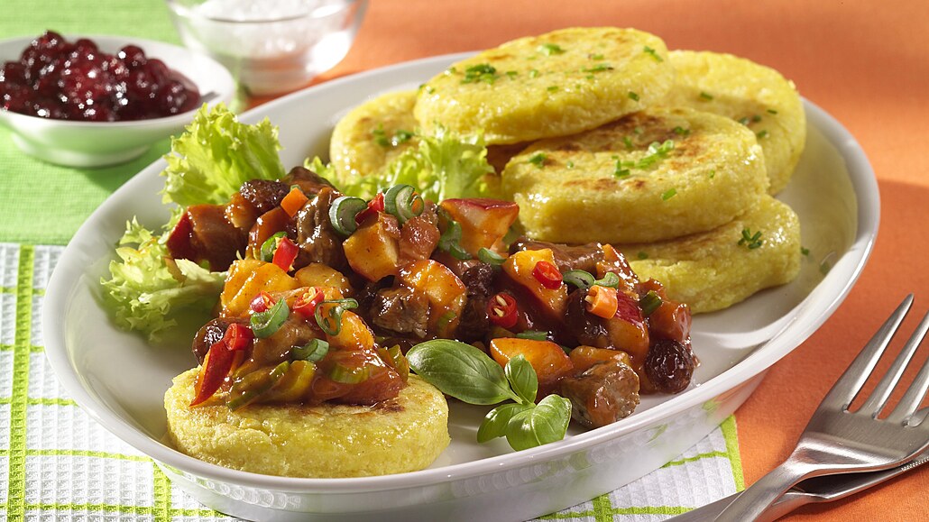 - Maso zalijeme vínem, zbylou marinádou, přidáme rozinky, brusinkový kompot a na malé kostičky nakrájená jablka. Přiklopíme a dusíme asi 20 minut. Pak sundáme pokličku a necháme šťávu zredukovat. Masovou směs podle chuti dosolíme a podáváme s bramborovými plackami.