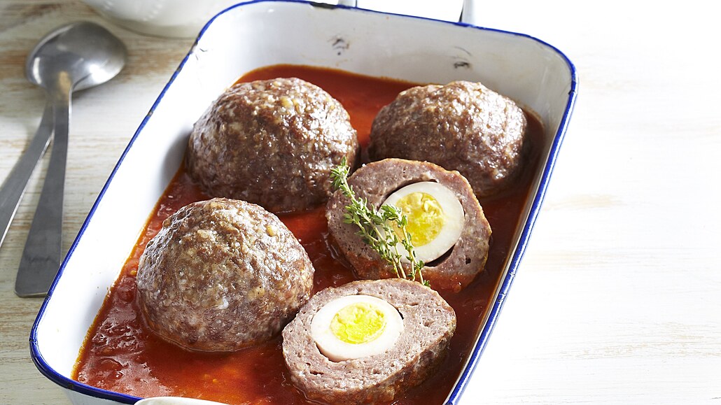 - Masovou směs rozdělíme na čtyři díly. Z každé části vytvoříme placičku, do které zabalíme oloupané vařené vejce a vytvarujeme koule. Opečeme je ze všech stran na pánvi s olejem, přendáme do omáčky a zakryté dusíme doměkka. Masové koule podáváme s rajskou omáčkou a těstovinami.