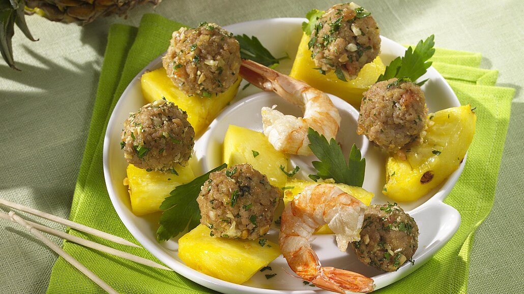 - Z hmoty odkrajujeme lžící stejně velké kousky a tvoříme z nich kuličky. Ananas oloupeme, nakrájíme na větší kousky a rozložíme na talíře. Na každý kousek položíme masovou kuličku, ozdobíme čerstvými bylinkami a celými krevetami.