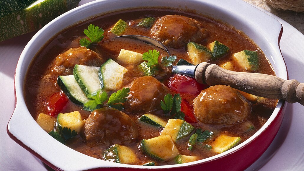 - Oloupanou cibuli zpěníme na oleji, zaprášíme hladkou moukou a usmažíme světle hnědou cibulovou jíšku. Přidáme dvě lžíce kečupu, asi 3/4 litru vody a necháme na mírném ohni vařit. Po pěti minutách varu vložíme do omáčky masové kuličky, omytá a na čtvrtky nakrájená rajčata, půl kostky zeleninového masoxu a vaříme dalších deset minut.