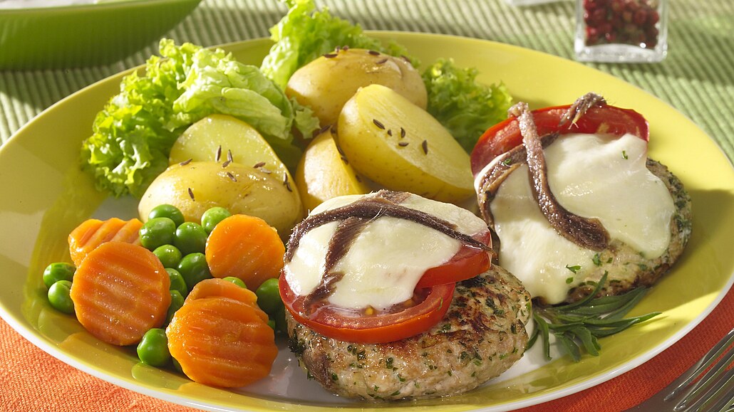 - Na pánvi rozpálíme olej a placičky po obou stranách osmažíme. Pak je naskládáme na plech a na každou položíme plátek rajčete a mozzarelly. Na sýr položíme křížem přes sebe rozkrojené filety z ančoviček.