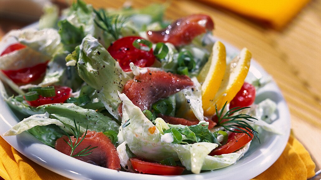 - Na talíře natrháme ledový salát a rozdělíme na něj matesy se zeleninou. Přelijeme připravenou zálivkou a ozdobíme čtvrtkou citronu a koprem. Jako přílohu podáváme pečivo.