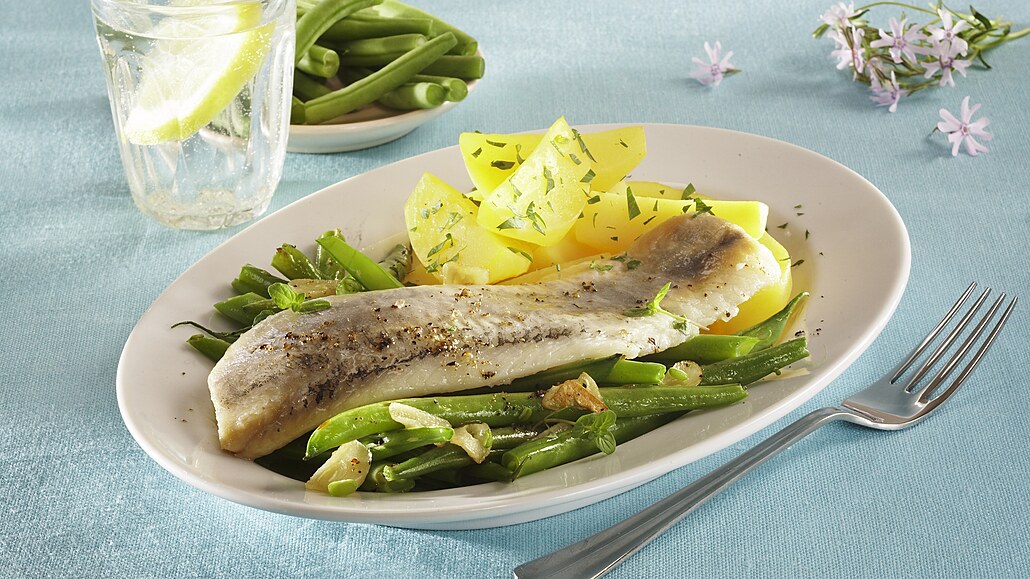 - Brambory a česnekové fazolky rozdělíme na talíře a posypeme nasekanými bylinkami. Na ně položíme matjesa a vše pokapeme šťávou z fazolek.