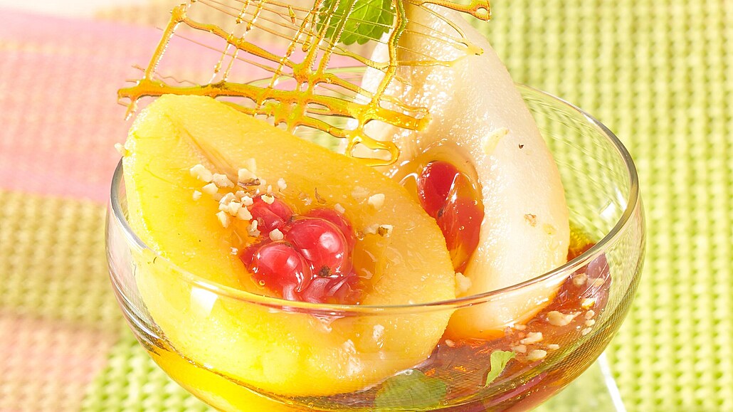 - Poloviny hrušek naplníme rybízem a rozdělíme je do misek. Přelijeme je teplou medovou omáčkou, ozdobíme kouskem karamelové mřížky a meduňkou.