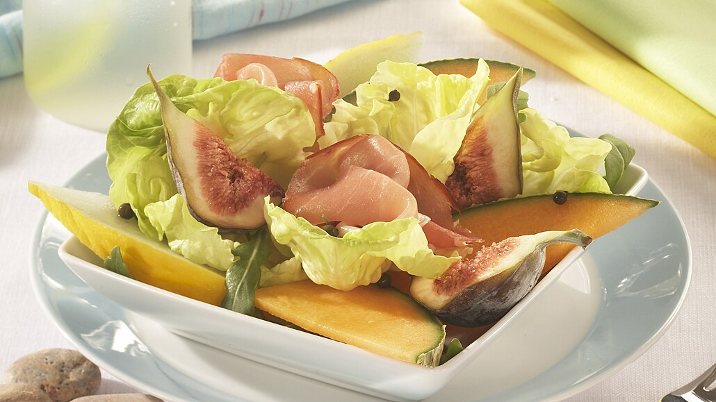 - Salát a ovoce narovnáme na talíře, přidáme plátky parmské šunky a posypeme kuličkami zeleného pepře. Zakapeme olivovým olejem, limetkovou šťávou a posypeme hoblinkami parmezánu.