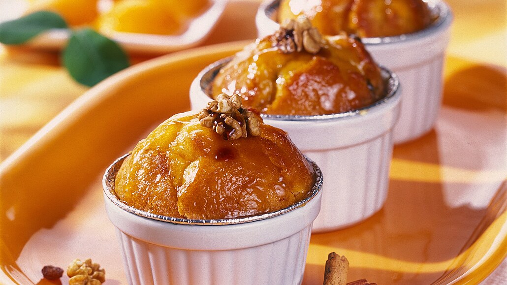 - Připravenou směs vlijeme do tukem vymazaných gratinovacích misek asi do jedné třetiny výšky. Misky vložíme do pekáčku s vodou a pečeme při 160-180 °C asi 30-45 minut. Dobře upečené dortíčky poznáme tak, že se po lehkém zmáčknutí prstem upečená hmota nevrací zpět. Upečené dezerty vyjmeme z vodní lázně a ještě za horka potřeme ohřátou meruňkovou zavařeninou.