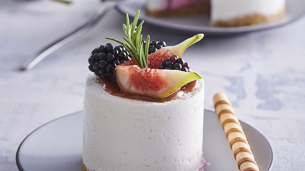 - Smetanu vyšleháme na pevnou šlehačku. Mascarpone smícháme s cukrem a šlehačkou na krém. Asi třetinu krému odebereme a přidáme do něj rozmačkané ostružiny, dužninu z fíků a najemno nasekané lístky rozmarýnu, směs promícháme a naplníme do menších formiček.