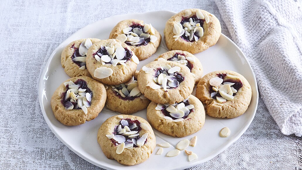 - Z těsta odkrajujeme kousky, které vytvarujeme do kuliček velkých asi jako vlašský ořech. Lehce je zploštíme a do středu vytlačíme důlek. Přendáme je na plechy s pečicím papírem. Džem naplníme do důlků a povrch posypeme plátky mandlí.