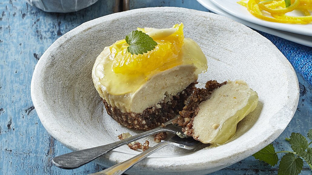 - Připravíme dortové želé podle návodu na obalu. Na povrch zatuhlých dortíčků položíme proužek pomerančové kůry a přelijeme dortovým želé. Z druhého pomeranče vykrájíme měsíčky čisté dužiny. Při servírování dortík ozdobíme pomerančem a lístkem meduňky.
