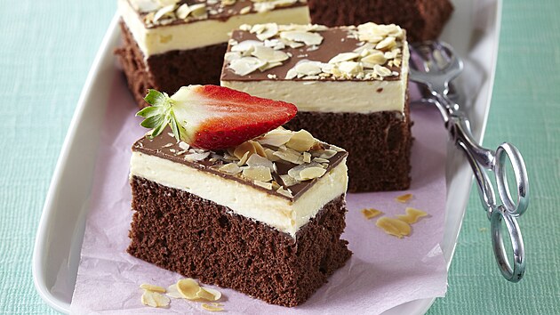 - Na horké vodní lázni rozpustíme máslo s čokoládou. Ztuhlý moučník potřeme na povrchu polevou a posypeme mandlovými lupínky. Necháme ztuhnout a pak nakrájíme na porce. Můžeme ozdobit jahodami.