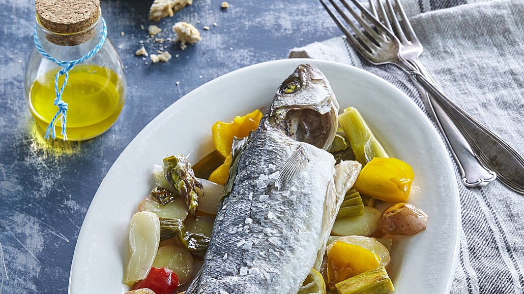 - Mořského vlka umyjeme, osušíme a osolíme. Necháme odležet asi 20 minut a odsajeme přebytečnou vodu. Zeleninu nakrájíme na větší kousky, brambory na tenké měsíčky, řapíky celeru na drobné kostičky a jarní cibulku na kolečka.