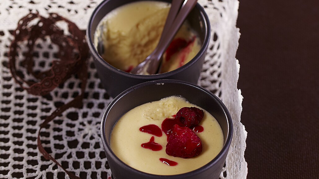 - Maliny promícháme s cukrem a necháme je chvilku odstát. Vychlazenou pěnu ozdobíme malinami a přelijeme šťávou, kterou pustily.