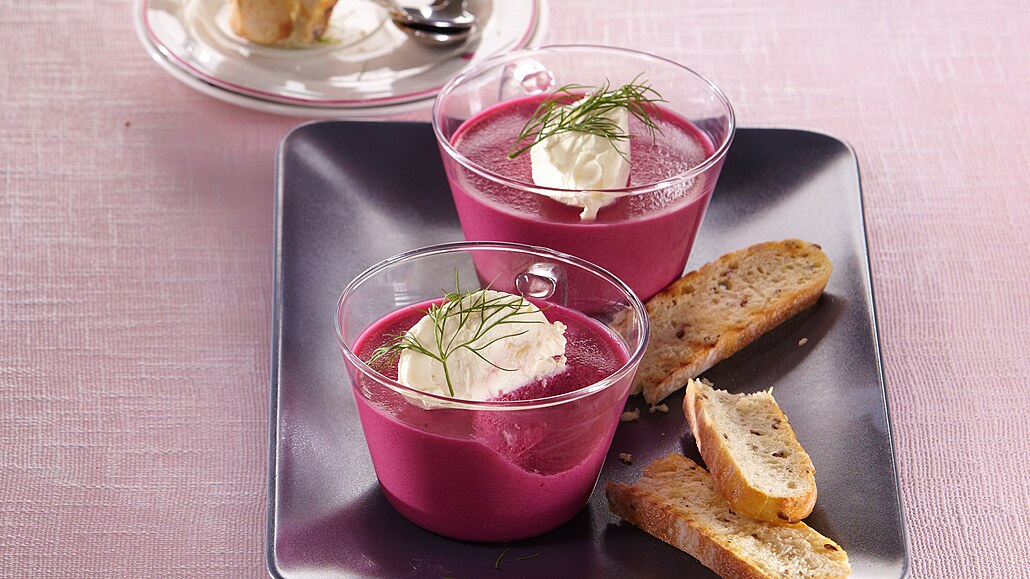 - Řepu rozmixujeme a smícháme ji se zakysanou smetanou a lžičkou nastrouhaného křenu. Do řepného krému vmícháme smetanu s želatinou a dochutíme solí.