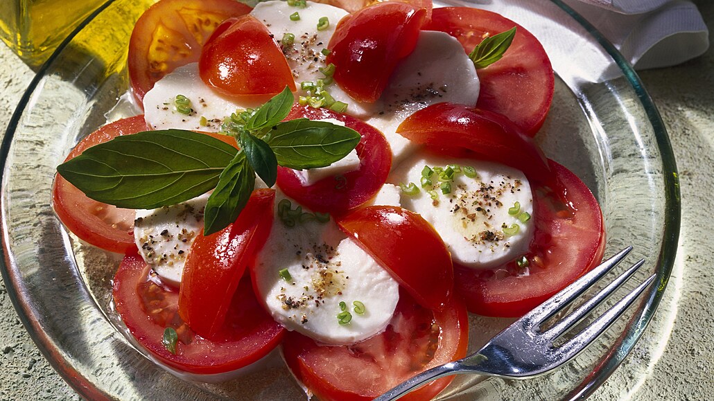 - Rajčata omyjeme, nakrájíme na tenká kolečka. Mozzarellu také nakrájíme na kolečka. Na talířky poskládáme střídavě mozzarellu a plátky rajčat, doprostřed stočíme listy salátu a posypeme je kolečky cibule.