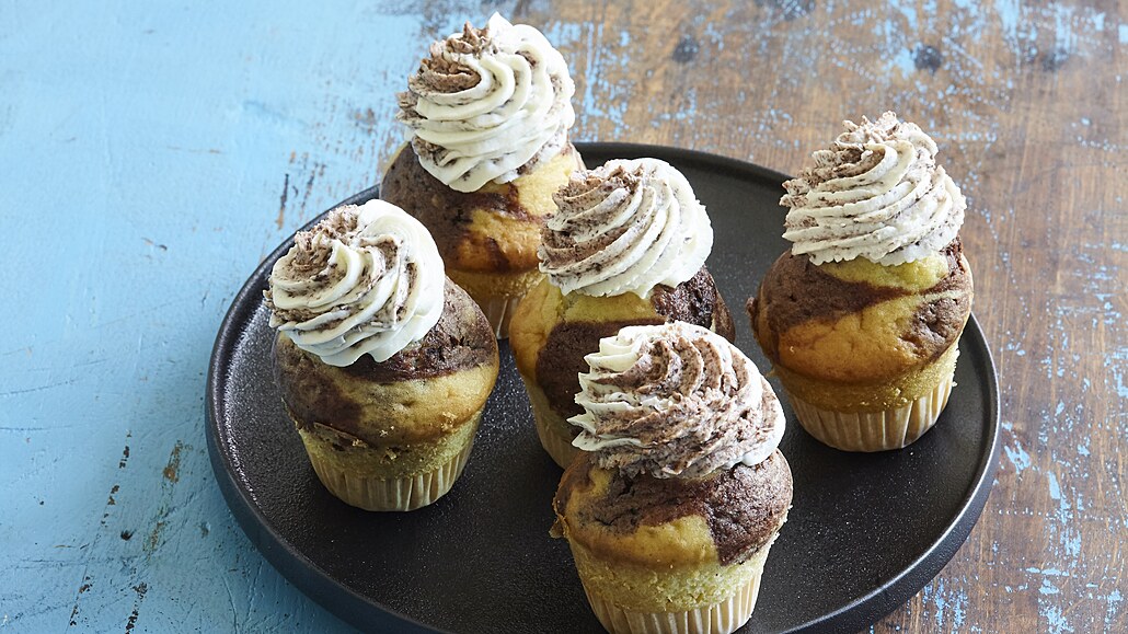 - Pomocí špejle pak světlé i tmavé těsto v košíčkách ozdobně promícháme tak, abychom vytvořili lehké mramorování. Pečeme v troubě vyhřáté na 165 °C asi 25 minut. Necháme vychladnout.