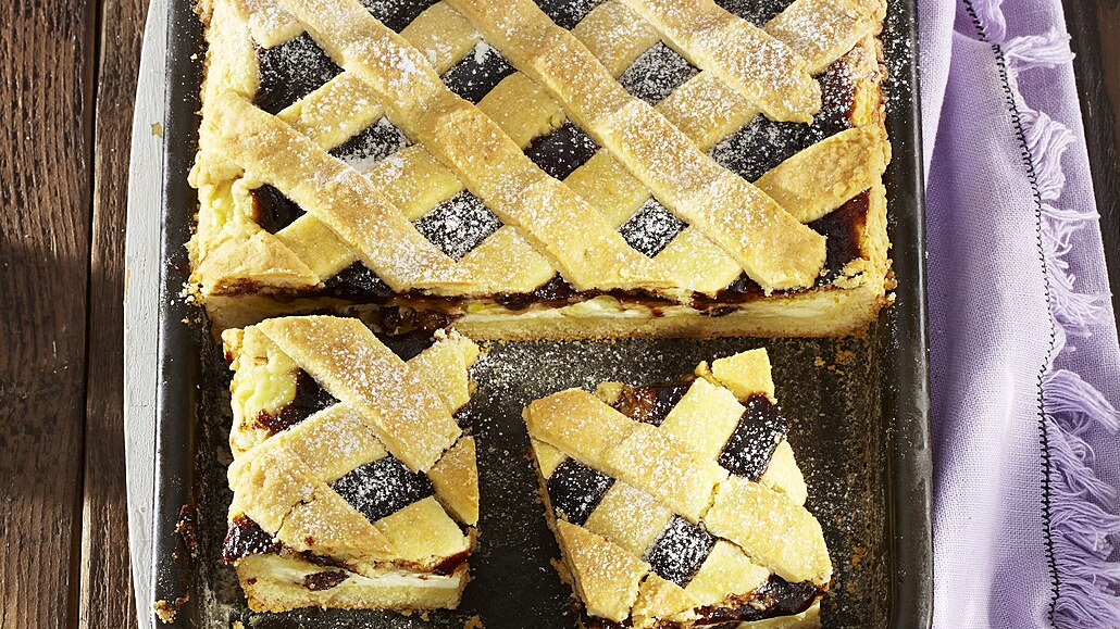 - Třetinu těsta rozválíme na obdélníkový plát a přeneseme ho na plech vyložený pečicím papírem. Potřeme ho tvarohem a povidly. Zbylé těsto rozválíme na plát a rádélkem z něj nakrájíme proužky, ze kterých na koláči vytvoříme mřížku.
