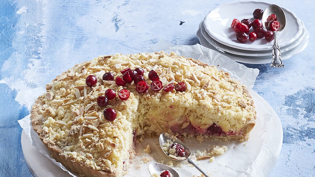 - Jablka očistíme a nakrájíme na slabé plátky. Pokapeme je citronovou šťávou a promícháme s cukrem, škrobem a brusinkami. Náplň rozprostřeme na těsto ve formě. Všechny suroviny na drobenku propracujeme a posypeme jí povrch koláče. Pečeme v troubě vyhřáté na 170 °C asi 25 minut dozlatova. Koláč necháme vychladnout a před podáváním můžeme dozdobit čerstvými brusinkami a mandlemi.