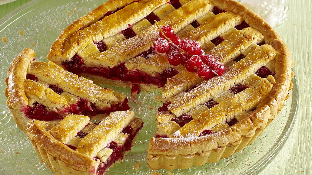 - V misce promícháme rybízový džem se škrobem a omytým a osušeným rybízem. Zbylé těsto rozválíme a vykrájíme z něj proužky. Na mírně zchladlý předpečený korpus rozetřeme rybízovou náplň. Na povrch rozdělíme proužky těsta do mřížky a potřeme rozšlehaným žloutkem.