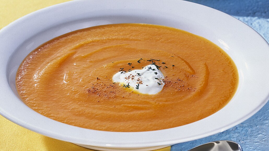 - Zchladlou polévku rozdělíme na talíře a podáváme s kopečkem zakysané smetany a posypanou nastrouhaným muškátovým oříškem. Ozdobíme snítkou tymiánu.