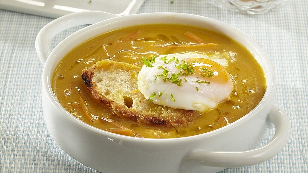 - Plátky bagety opečeme v toustovači nebo nasucho v troubě dozlatova. Mističky lívanečníku vytřeme olejem a z vajec v nich připravíme volská oka. Polévku rozdělíme do talířů. Každou porci doplníme plátkem chleba, na který posadíme sázené vejce, a posypeme sekanou petrželkou.