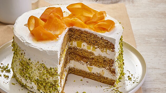 - Potřeme džemem a přiklopíme třetím dílem korpusu. Postup opakujeme a poté celý dort potřeme zbylým krémem, strany obalíme v pistáciích a dort uložíme do chladničky.