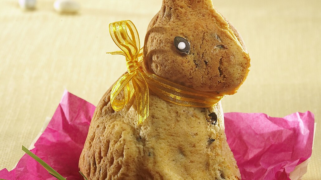 - Formu na zajíčka vymažeme tukem a vysypeme moukou. Naplníme ji těstem a pečeme v předehřáté troubě při 180 °C asi 20 minut, pak teplotu snížíme a dopékáme při 150 °C dalších 20 minut. Po upečení necháme zajíčka ve formě krátce zchladnout a pak ho opatrně vyklopíme. Oči uděláme z dýňových semínek a zajíčka pocukrujeme.