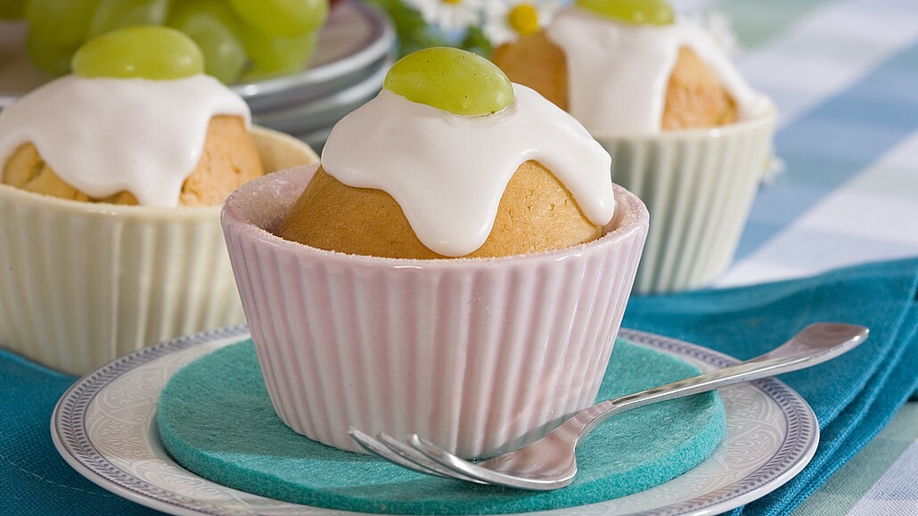 - Kuličky hroznového vína omyjeme a osušíme. Formičky na muffiny vymažeme tukem, vysypeme moukou, naplníme těstem a doprostřed vmáčkneme kuličku vína. Pečeme v předehřáté troubě při 180 °C asi 30 minut. Muffiny po upečení necháme ve formičkách vychladnout a pak je vyklopíme.