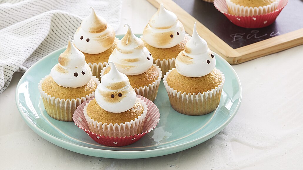 - Muffiny dáme dopéct do trouby při 180 °C asi na 5 minut na program gril. Po upečení necháme strašidýlka vychladnout a rozehřátou čokoládou uděláme na spodní bochánky pomocí špejle 2 oči.