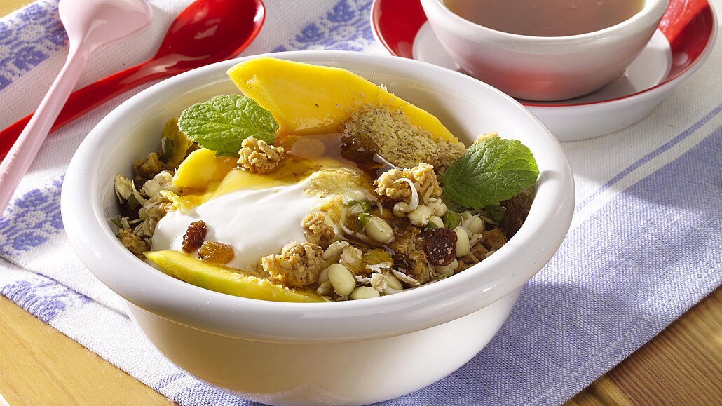 - Směs rozdělíme do dvou mističek, osladíme medem, zalijeme jogurtem a ozdobíme plátky manga a meduňkou.