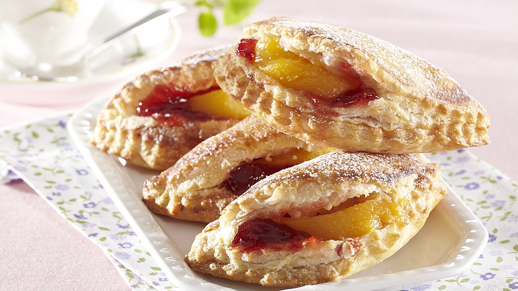 - Těsto vyválíme na plát silný 3 mm a vykrájíme kolečka o průměru 10 cm. Broskve nakrájíme na plátky. Do středu těsta dáme lžíci džemu a 3 plátky broskví.