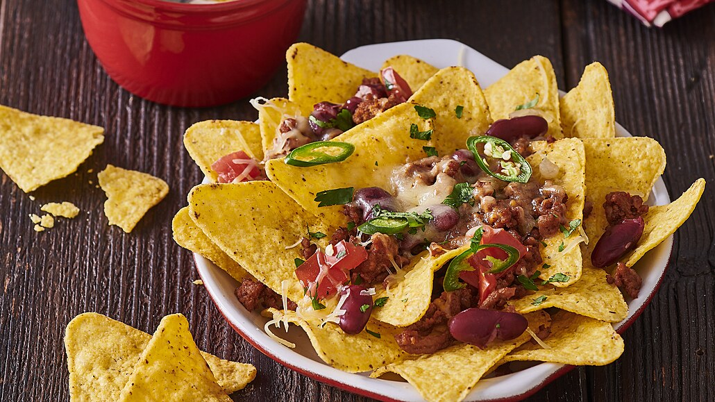 - Rajčata omyjeme, rozkrojíme na poloviny a odstraníme dužinu se semínky. Nakrájíme je na kostičky. Tortillové chipsy, masovou směs, rajčata a nastrouhaný sýr střídavě navrstvíme do žáruvzdorných misek a vložíme do trouby pod rozehřátý gril. Zapékáme, dokud se sýr nezačne roztékat. Poté vyndáme nachos z trouby, zakápneme dle chuti vymačkanou šťávou z limety, posypeme koriandrem a na kroužky nakrájenou chilli papričkou. Podáváme se zakysanou smetanou.