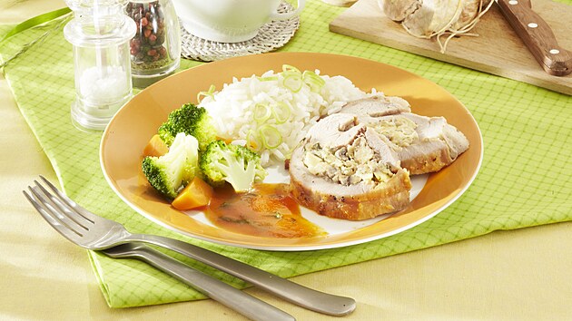 - Telecí hrudí naplníme nádivkou a převážeme kuchyňským provázkem. Vložíme je do pekáčku, osolíme, opepříme a přelijeme rozpuštěným zbylým máslem a vínem. V troubě je při 190 °C pečeme asi 50 minut. Dle potřeby je podléváme vývarem.