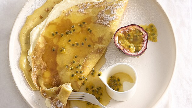 - Pánev zahřejeme a potřeme máslem. Vlijeme část těsta, rozlijeme ho po celé ploše a smažíme dozlatova po obou stranách. Palačinky uchováváme v teple. Teplé palačinky potřeme citronovým krémem, přehneme na polovinu, pocukrujeme a doplníme omáčkou z citronového sirupu a mučenek.