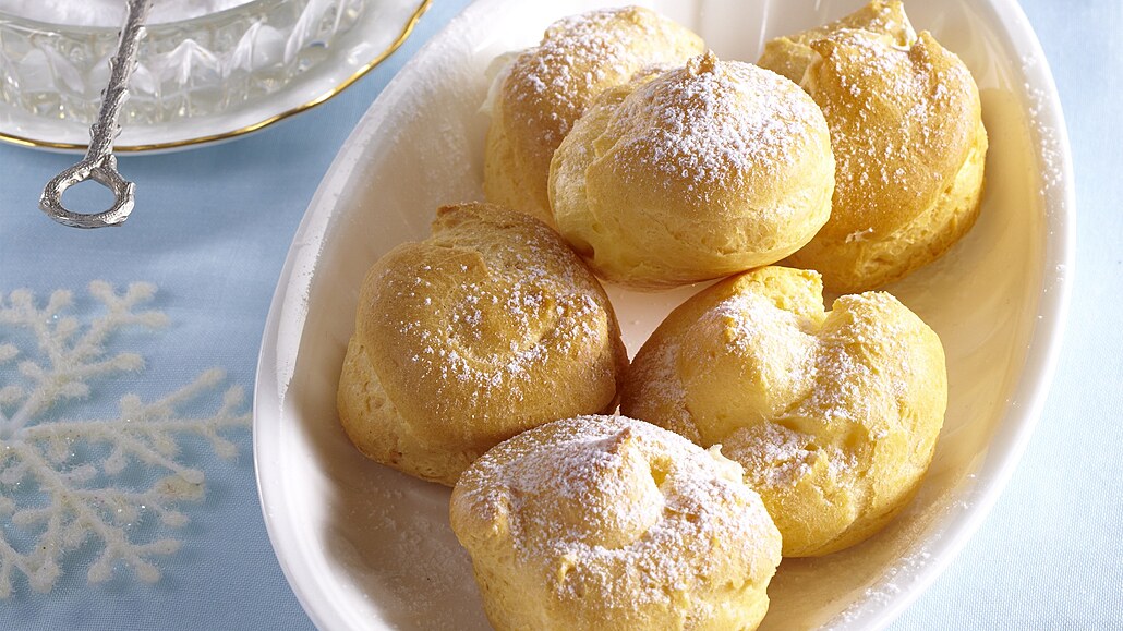 - Z mléka, pudinkového prášku a cukru uvaříme hustý krém. Zakryjeme ho potravinovou fólií a necháme vychladnout. Pak ho rozšleháme a zlehka do něj vmícháme ušlehanou šlehačku. Krém pomocí úzké trubičky nastříkáme do profiterolek, uložíme do chladničky a před podáváním poprášíme moučkovým cukrem.